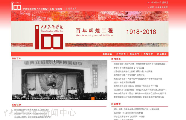 经过近一个多月的筹备建设,由党委宣传部、教育技术中心联合建设36365路检测中心“百年辉煌”工程专题网站http:/2018/近日上线。网站开设“bet36365路检测中心”、“名师名作”、“图说百年”、“美院往事”和“历届校友”等栏目,全面展示百年办学历程,及时发布“百年辉煌”工程实施进展,凝练美院百年文化传统。今后,网站还将继续挖掘整理、展示美院珍贵的一些图片、文字影像资料,特别是老一辈艺术家的纪录及教学影像资料,为实施百年辉煌工程及网上校史陈列做好基础性工作,同时为我院进行传统教育提供良好的平台。