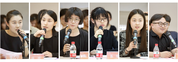 学生代表结合自己的专业学习和在学生组织中的工作实践发言,就各自的学习、生活,畅谈了自己的思想,提出自身成长发展的目标。校学生会主席徐乙宁表示,美院同学们要将个人的艺术追求与国家民族的前途命运和人民群众的文化需求紧密相连,学生会将进一步发挥自我服务、自我管理、自我教育职能,努力为同学们的全面发展服务。校研究生会主席陈瑶表示,美院研究生要增强青年人的历史责任和担当,在“两个一百年”的奋斗目标引领下,不断提升自我,研究生会将继续致力服务于高端艺术人才的成长。社团联合会主席陈鸽介绍了美院学生社团在服务学生全面成长中所开展的各项特色活动,今后还将继续开展健康有益、丰富多彩的课外活动和服务活动。建筑学院研究生党支部组织委员苏曼同学提出,学生党员干部要发挥好模范带头作用,鼓励引导优秀青年学生积极向党组织靠拢。城市设计学院2014级产品设计工作室班长关梦婷表示,美院学生身处最好的时代和最好的学府,应充分利用校内外资源,通过不断创新,用艺术来创造价值。艺术管理与教育学院研究生班班长高宇表示,艺术人才要贴近生活、贴近社会,努力学以致用,用艺术去链接大众、社会和世界。