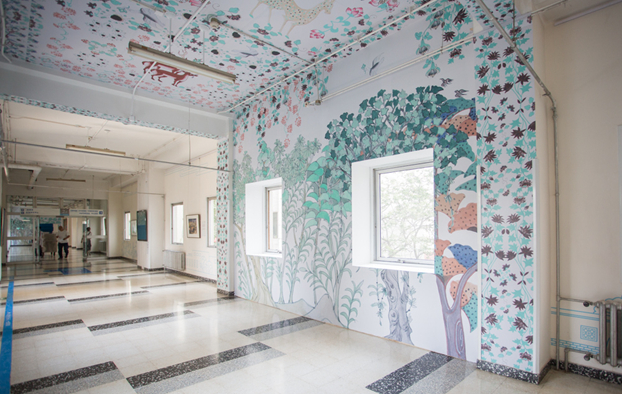 参观过程中,展览总监岳洁琼特别向嘉宾做了导览。文化长廊由敦煌壁画中的建筑物局部场景喷绘为起点,借助五条贯穿了敦煌经典纹样的装饰带,引导观众穿行长廊,经过一个装点为洞窟意象的空间,在呈现出繁盛生命活力的满铺植物、花卉墙面前结束。作品在这样的长廊中展出,蕴涵着丰富的意味。著名艺术家常沙娜先生对于展览提供了有力的支持,文化长廊中喷绘的富有生命力的植物纹样和动物图案是由展览设计师吴帆根据常沙娜先生的作品进行再度创作完成的。
